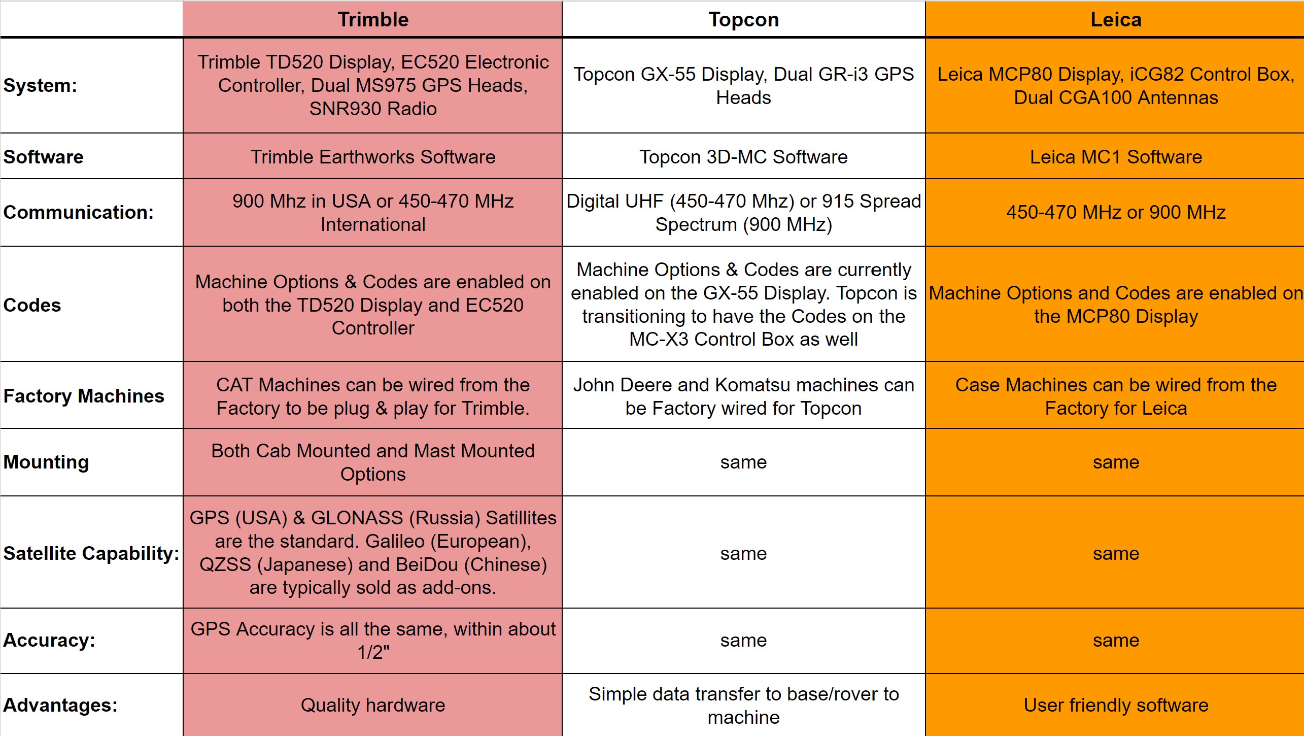 Comparing the Trimble Earthworks, Topcon 3D-MC and Leica MC1 GPS Machine Control packages. These kits are typically on Construction Sites for Automatic and Indicate Control of Dozers, Graders, Excavator, Scrapers, Skidsteers and more.